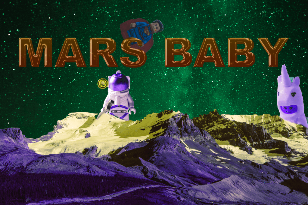 First, I established the background image and enabled the text as a wide, bold option. I made the text 3D and more impactful. I then used the Brush tool on several Lego images with space or imaginary backgrounds to fade them into both the title (Mars Baby) as well as the mountainside. The gradient also provides a terrific contrast.
