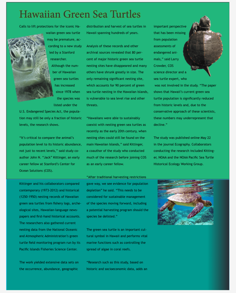 I had a ton of trouble with this initially. I failed to get the Photoshop cut I wanted, but I compensated by adding a green variant on the bottom of the poster. I even cut off the head of a poor turtle by cropping it wrong. But after attending extra help, I was able to get the columns and word spacing, so it does look better now. I fixed the turtle, and moved it around to that the words still flowed freely on the page. After working on it in extra help, I am happy that the poster looks much better now. Thank you!