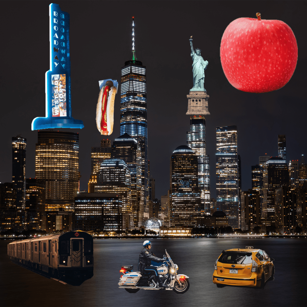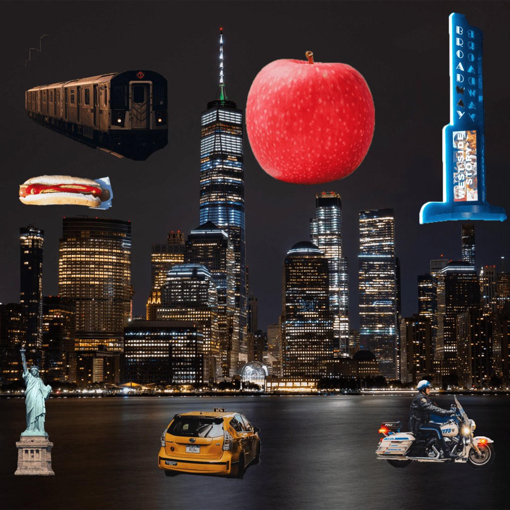 First, I found a background that was both scenic and represented the theme I wanted to convey. A skyline of New York was exactly what I wanted as a starting point. I started to cut out symbols and other images that represented New York in a separate document. The images I chose, like the “Big Apple” and the Statue of Liberty are good representations of New York. I considered where they were relative to the background, so that the cars and vehicles remained near the ground and larger images filled the skyline.
